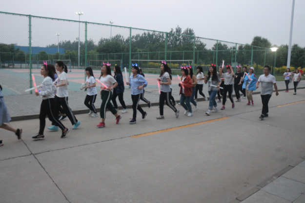此次荧光夜跑活动以班级为单位,从第三食堂出发,途经公司后花园、新图书馆、排球场三个站点,最终在轮滑场汇合。同学们头戴荧光饰品、手持荧光棒及气球,奔跑在经贸校园内,构成了一道靓丽的风景线。同时各个站点还分别设置了“不倒森林”、“三人两足”、“摸石过河”等别出心裁的素质拓展游戏。同学们一路上欢声笑语,锻炼了体魄,增进了友谊。