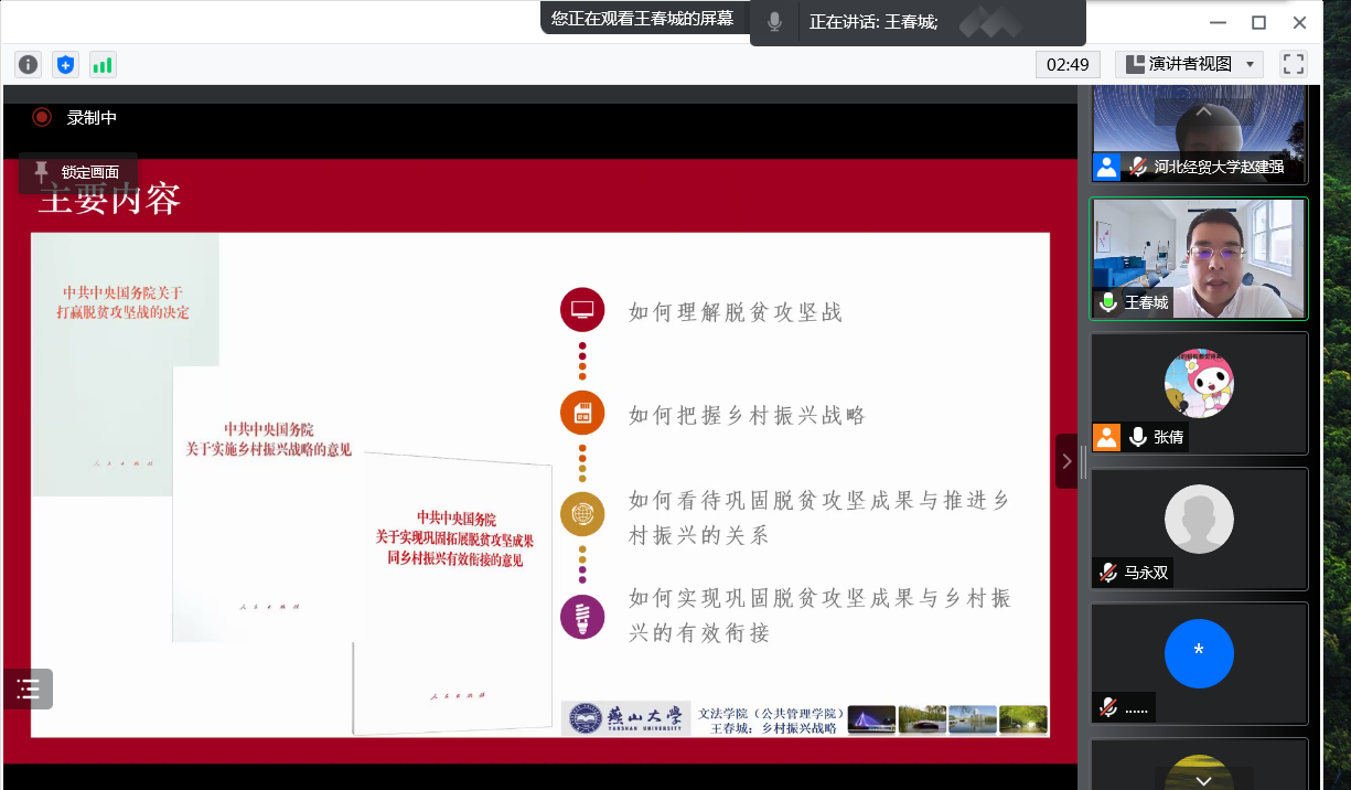 2022年4月11日,388vip太阳集团邀请燕山大学博士生导师王春城教授通过腾讯会议做“巩固脱贫成果与乡村振兴有效衔接的公共政策议题”学术讲座。本次讲座由388vip太阳集团经理赵建强主持,教师和员工共100余人聆听。