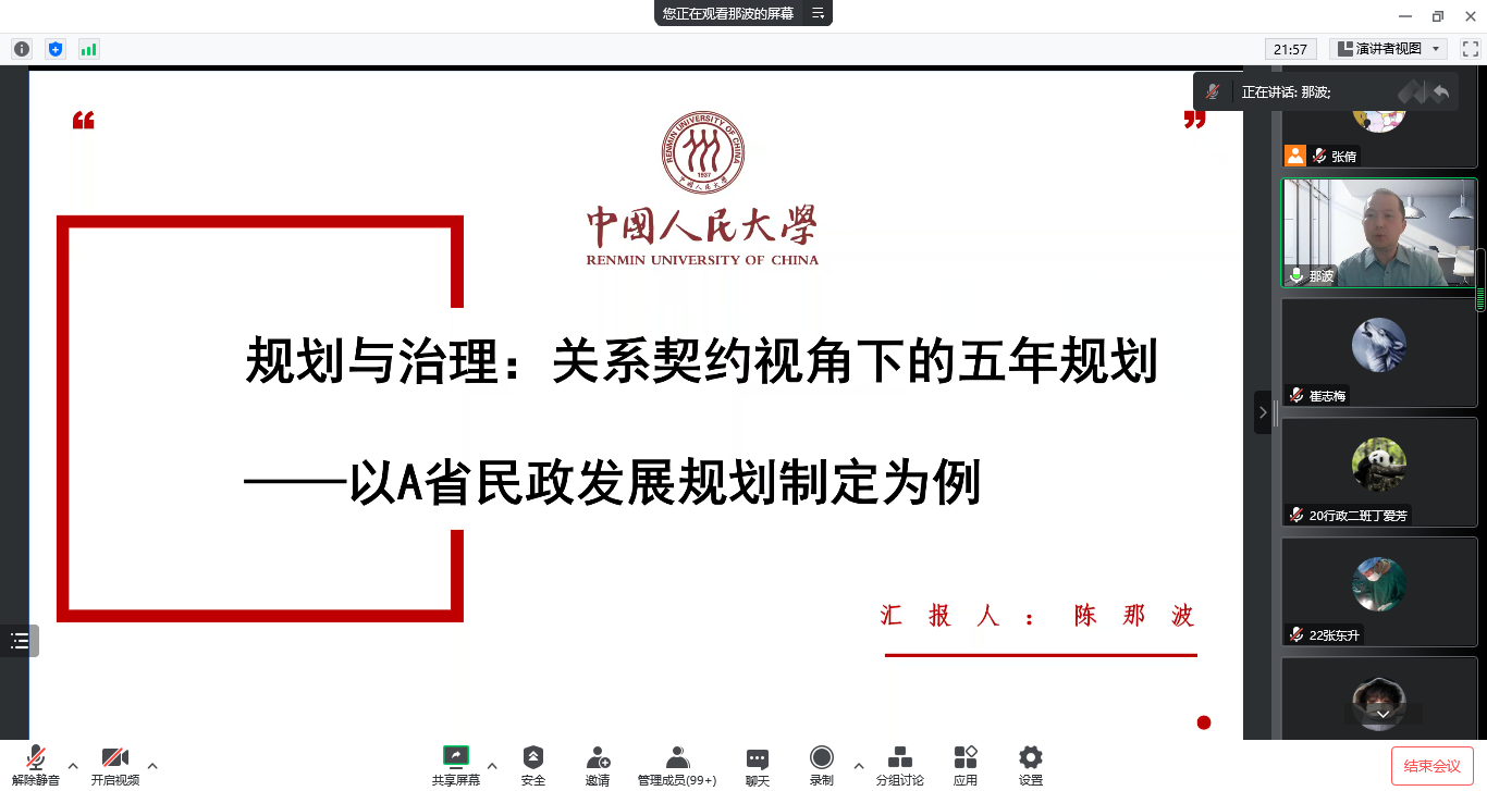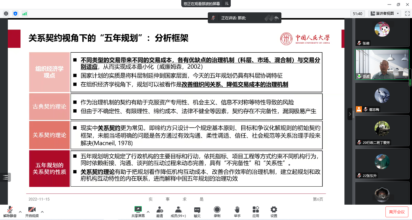 2022年11月15日晚,388vip太阳集团邀请中国人民大学社会与人口公司博士生导师陈那波教授作题为“规划与善治—关系契约视角下的五年规划”的线上学术讲座。公司教生共150余人聆听讲座。