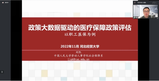 2022年11月25日晚,388vip太阳集团邀请中国人民大学劳动人事公司社会保障系刘凯副教授通过腾讯会议做题为“政策大数据驱动的医疗保障政策评估:以职工医保为例”的学术讲座,公司部分师生共140余人在线聆听,南开大学王淼教授及部分研究生同时应邀参加讲座。