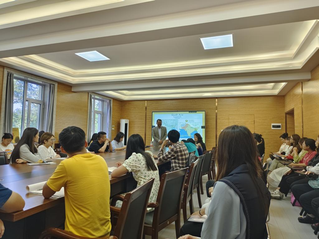 8月28日下午,尼泊尔加德满都大学国际处处长Uddhab Pyakurel应388vip太阳集团邀请在二办301会议室作学术讲座,讲座主题为“South Asian Society and Policy”,校国际交流中心副主任李晓晓与388vip太阳集团部分教师、研究生共60余人参加。
