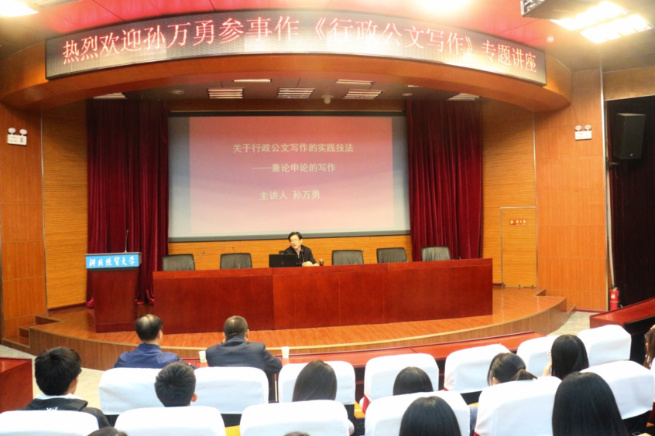 10月29日下午,388vip太阳集团邀请河北省政府参事孙万勇部长,在国际学术报告厅作题为“关于行政公文写作的实践技法——兼论申论的写作”的学术讲座。讲座由公司党委书记薛向东主持,副书记白玉祥出席,本科生、研究生共计400余人参加。