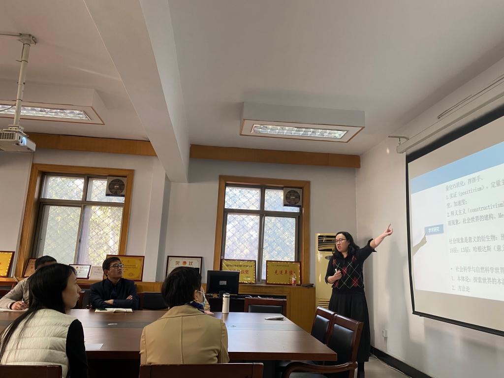 王敬结合自身田野调查以及论文发表经验,带领师生们认识了质性研究中的田野调查。她首先讲述了田野调查的步骤、田野笔记的程序、田野访谈需要注重的细节;其次,介绍了质性研究与大多数实证研究不同,是不进行预设问题和预设答案的定性研究,是对某种现象在特定情形下的特征、方式、涵义进行观察、记录、分析、解释的过程。她提出调查研究是基于“经典+经验”模式,经典指的是田野调查前的读书准备,经验则意味着深入乡村了解现实情况。最后,王敬讲述了田野调查报告的撰写过程。
