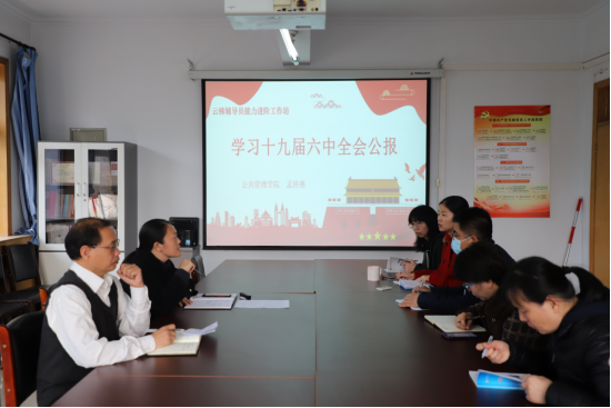 11月16日,388vip太阳集团在二办403举办第3期“云梯”辅导员能力进阶工作坊,主题为“学习党的十九届六中全会精神”,工作坊由院党委副书记孟祥燕主持,全体辅导员参加。
