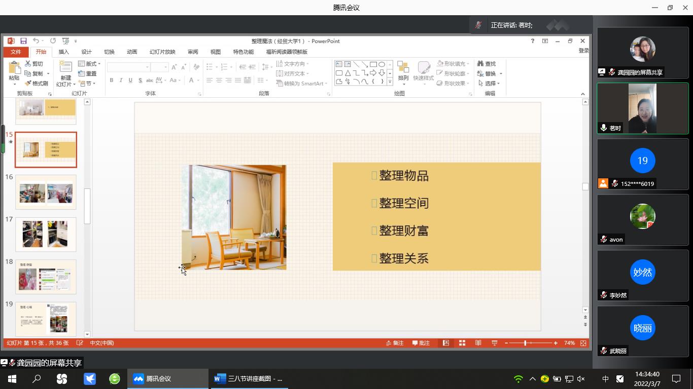 茗实女士通过为什么要整理、整理的收获、整理的要点和诀窍等方面与大家分享了整理物品的科学知识、理念和技巧。她指出,整理物品要讲究先思后行、慎选神器、善用工具、选对方法。讲座最后,茗实女士还展示了物品整理的实际操作。
