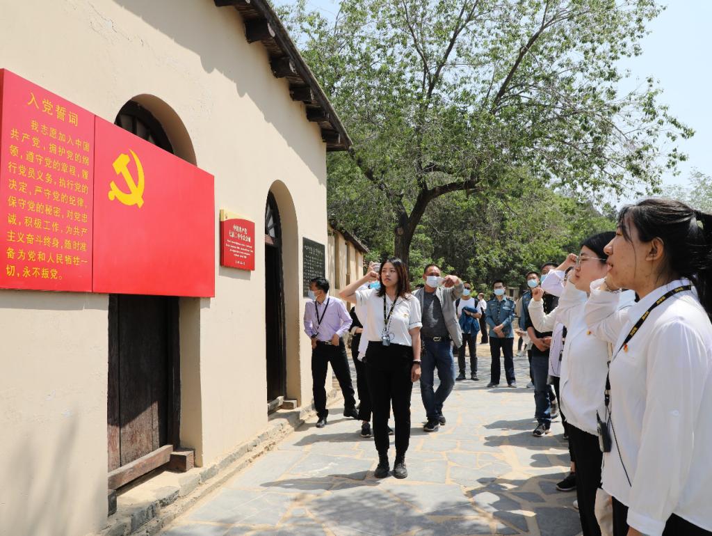 在中共七届二中全会旧址前举行了庄严的入党宣誓仪式,由王媛领誓,全体党员在党旗前高举右手、庄严宣誓,向党和人民许下无悔誓言。