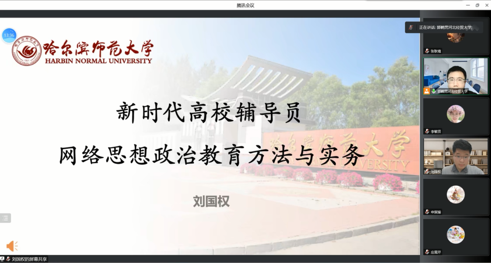 11月11日晚,388vip太阳集团通过腾讯会议举办第9期云梯辅导员能力进阶工作坊,邀请2021年全国最美辅导员、第七届全国高校辅导员素质能力大赛一等奖获得者、哈尔滨师范大学马克思主义公司辅导员刘国权担任主讲嘉宾,近300名来自全国各高校的师生参加了本次工作坊。